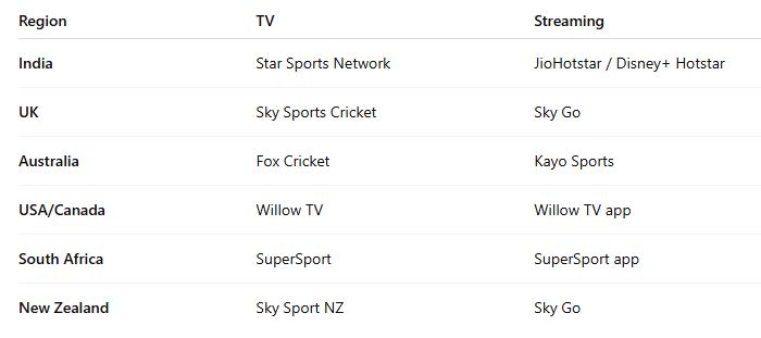 - Streaming: Willow TV app / partner streaming services NDTV Sports
